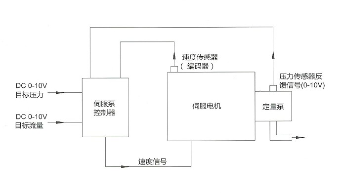 伺服液压系统采用定量泵与伺服电机组成,由伺服泵控制器根据压力传感器与速度传感器反馈的信号自动调节伺服电机的转速,以达到液压系统所需的压力和流量,系统全闭环控制,没有溢流损失,节能效果明显。由于伺服电机惯性小,响应快(流量由零至最大输出流量一般约100ms左右)。控制精度高,压力流量控制精度一般小于±0.5%,重复精度一般小于±0.5%。